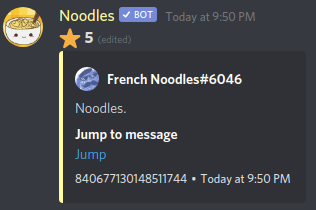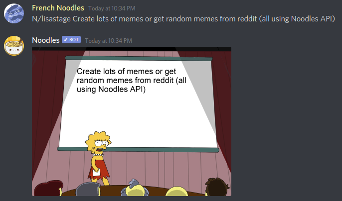 Noodles has a vast array of commands you can use to create memes or even get random ones off reddit, have your fun!