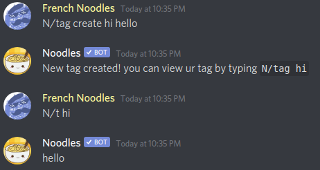 Tags are our take on custom commands, you can create tags that respond with certain text and while setting up the tag you can make it do stuff like mention the user using the tag and other stuff to make it more customizable