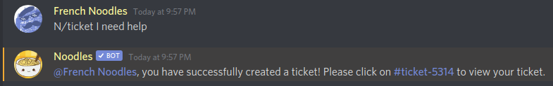 Noodles also has a ticket system you can use to help your members get support or at least just private chat with admins, after the ticket is closed you can even get a link to a transcript so nothing is lost!
